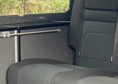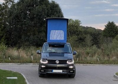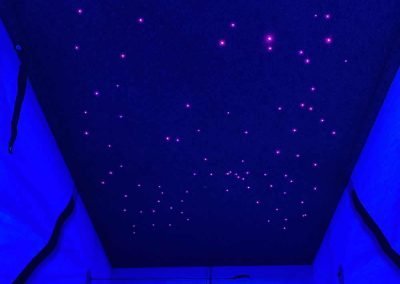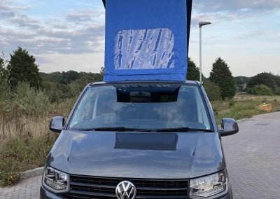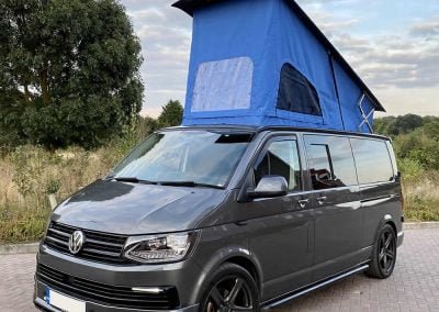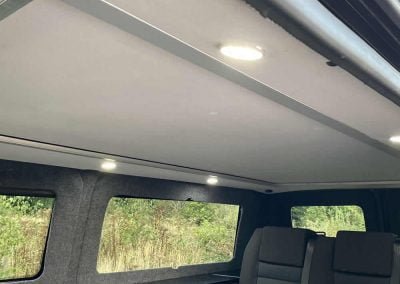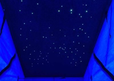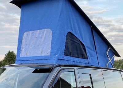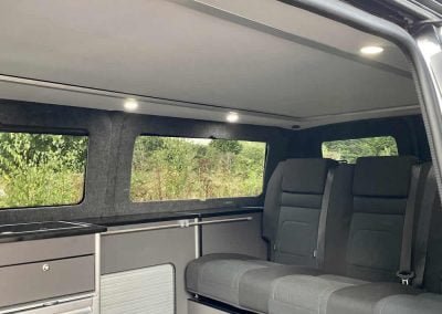 We supplied and fitted a Hilo roof with an indigo blue canvas with zip out scenic canvas. The roof was colour-coded to the van and we lined the new interior roof with original headlining to keep it light and airy. The existing LED lights were relocated and mounted. We carpeted the bifold bed and pop top roof in anthracite and scattered fibre optics through the carpet on the pop top lid.